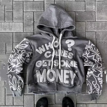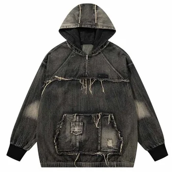 Custom Men's Denim Raw Edge Street Oversized Distressed Hoodie with Zip 400gsm Washed Best Hoodie Manufacturer